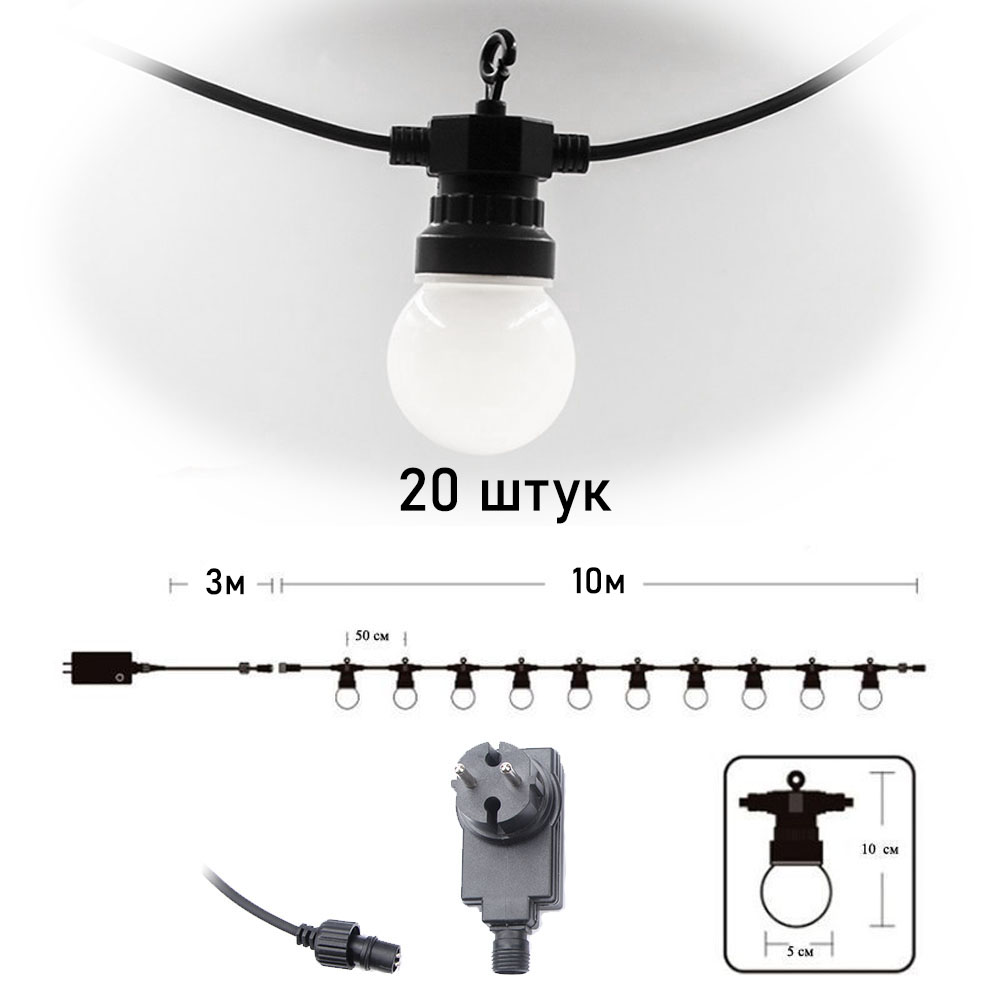Гирлянда Патио из диодных ламп от сети 10м 5см х 20шт, белые