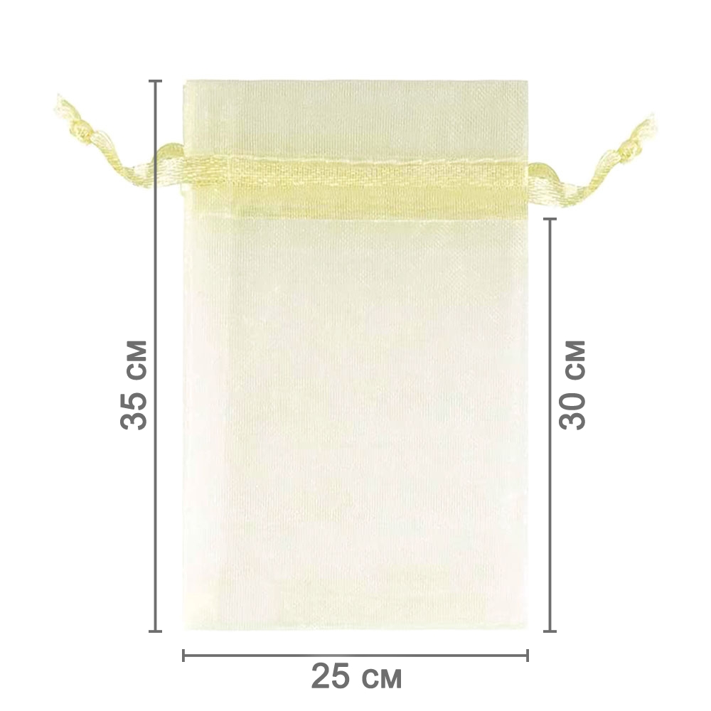 Мешочек из органзы 25 х 35 см — практичный аксессуар для упаковки крупных предметов и подарков. Лёгкая ткань подчёркивает содержимое и придаёт праздничный вид.