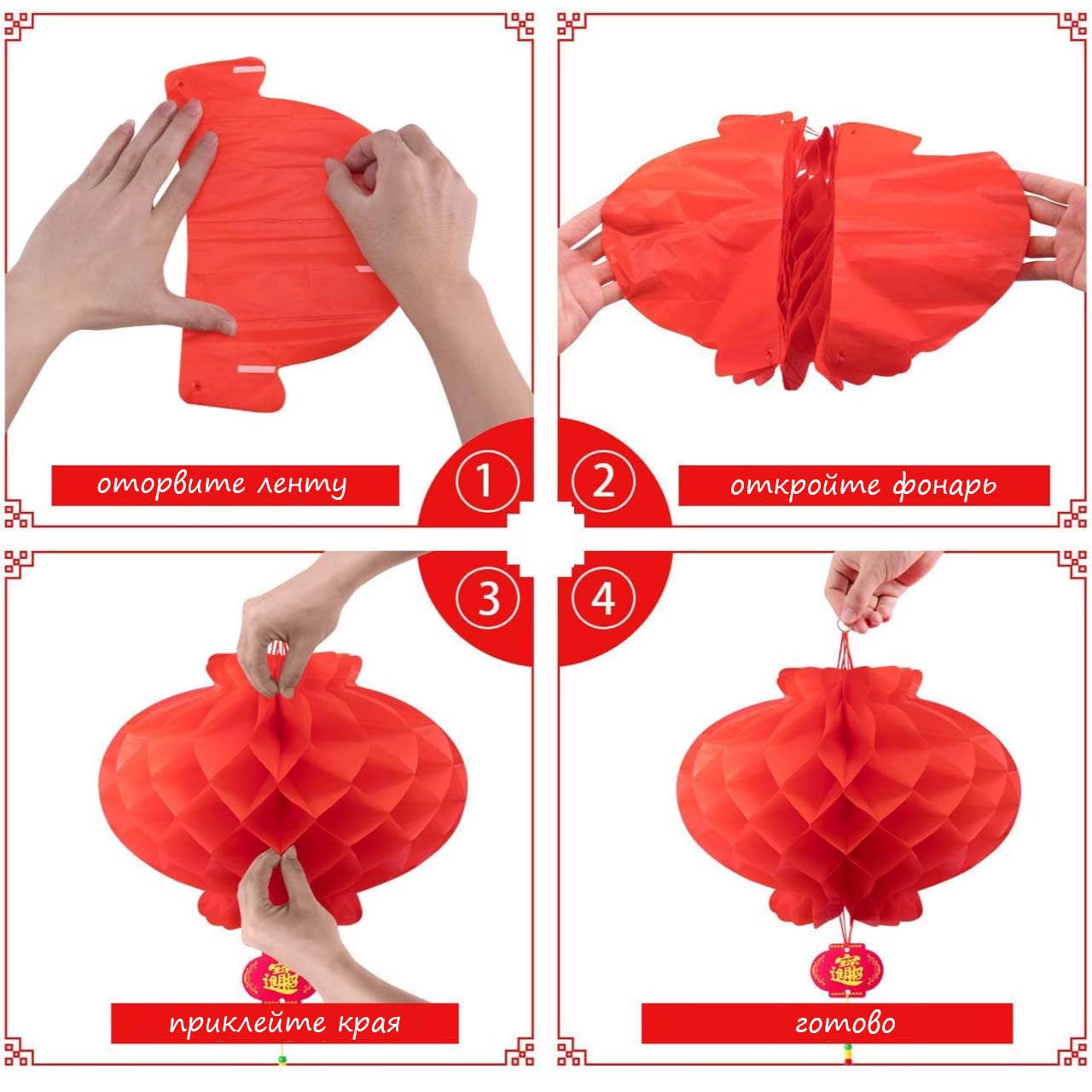 Простота в использовании: Бумажные фонарики имеют форму пчелиных сот с плотными отверстиями, их легко разворачивать и сворачивать. Раскройте концы и склейте их вместе (белая липкая двусторонняя лента на одном конце). Красный бумажный фонарь с кольцом и веревкой сверху легко подвешивается и снимается.