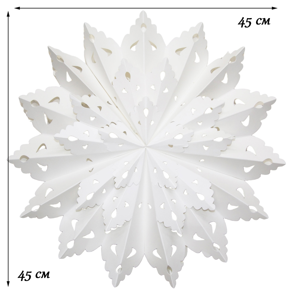 Снежинка на липучках размером 45 см, белого цвета, изготовлена из высококачественной бумаги.