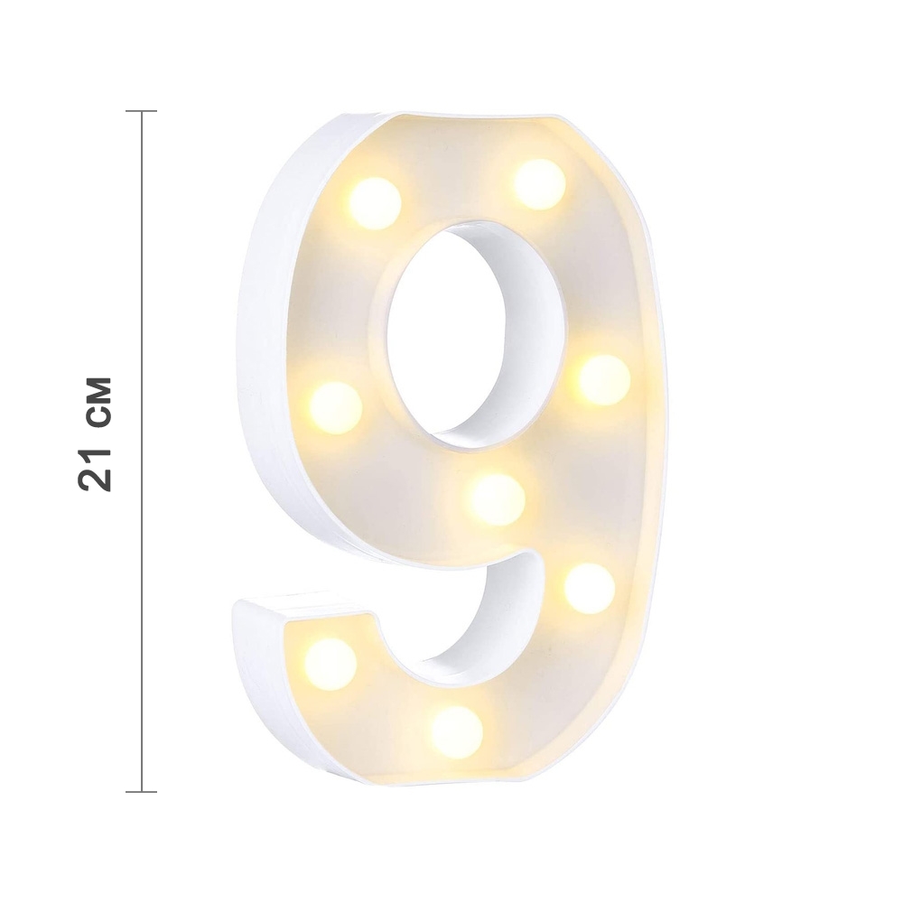 Цифра 9 светодиодная 21 см, от батареек , теплый белый