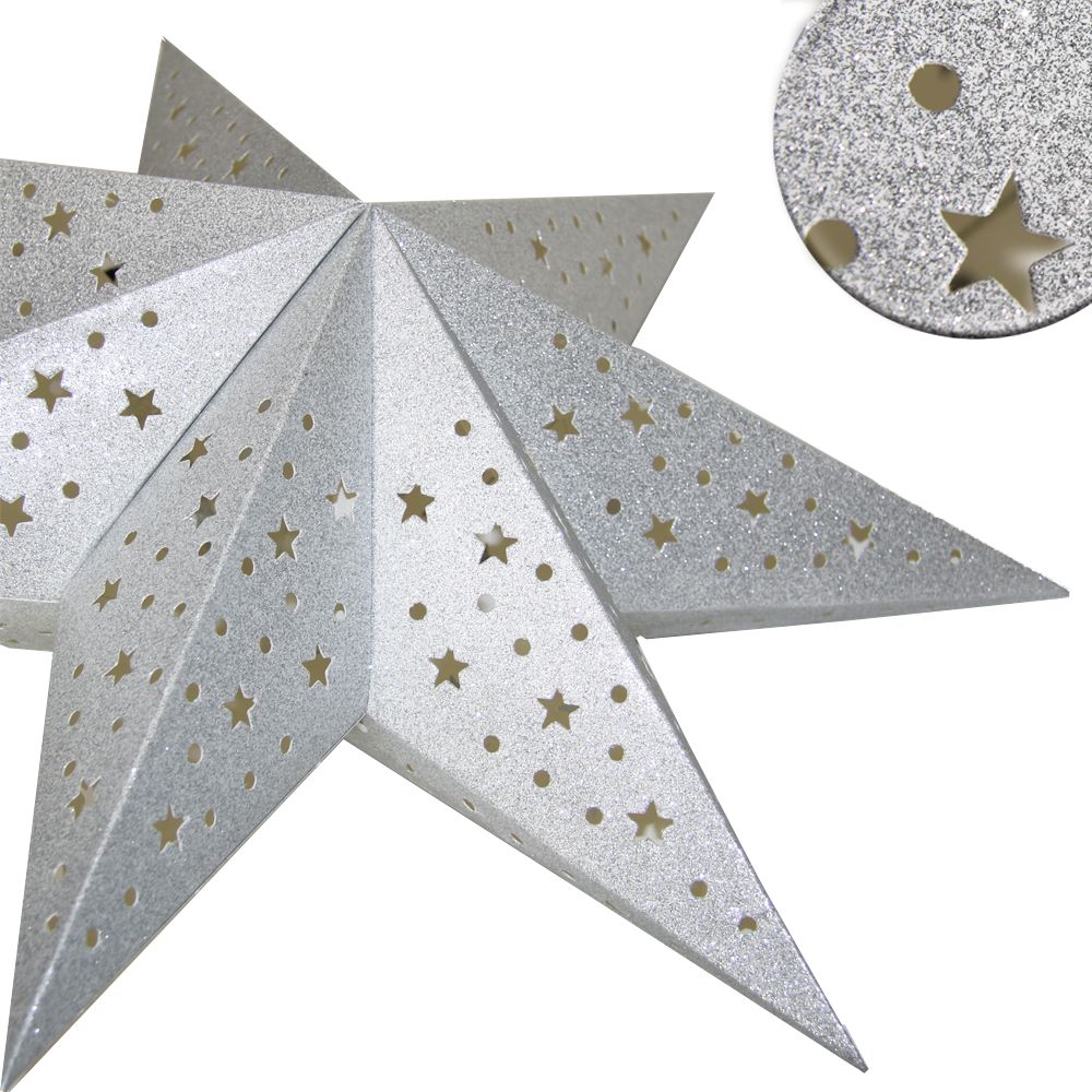 Семиконечная объемная звезда 45 см — великолепный декор из тонкого перфорированного картона с серебристыми блестками. Создает красивые световые эффекты. Поставляется в сложенном виде, в комплекте шнур для фиксации объема и подвеса.